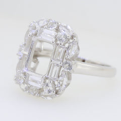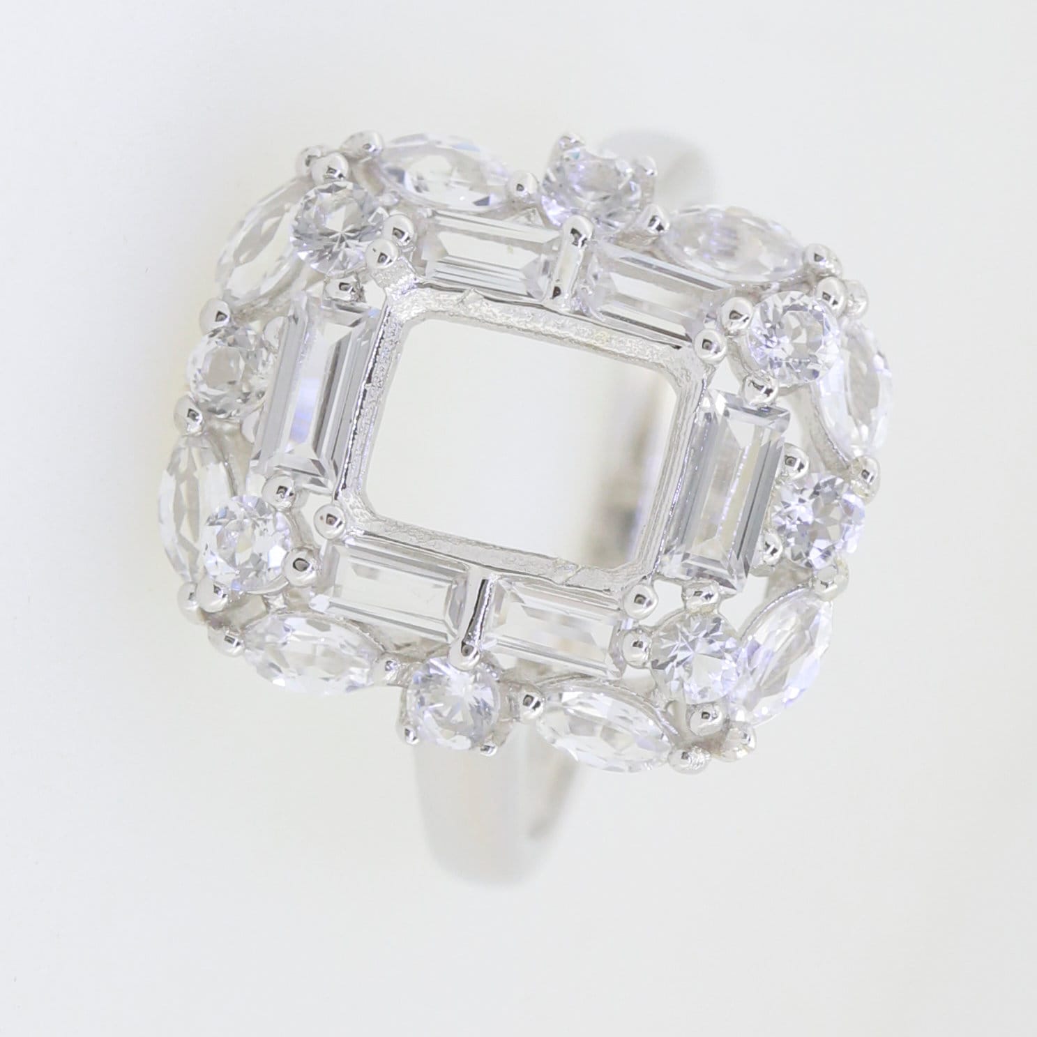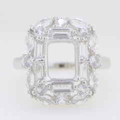 Sterling silver semi mount ring setting with emerald, baguette, and marquise double halo design.